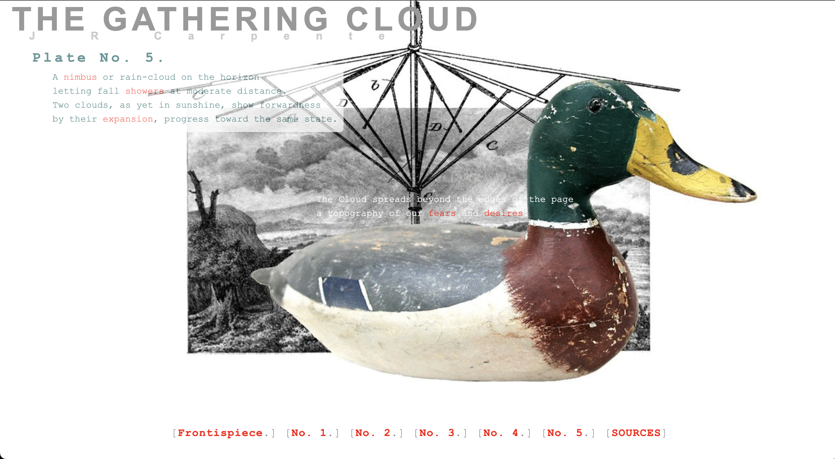Dans son œuvre hybride print/web The Gathering Cloud, J.R. Carpenter mobilise sans cesse des figures animales pour rendre perceptible la matérialité du cloud. La dissonance cognitive non hasardeuse entre le fantasme culturel du stockage dans le cloud et les faits concrets de son impact environnemental est en partie comblée par cette évocation constante des animaux: « A cumulus cloud weighs one hundred elephants. A USB fish swims through a cloud of cables. Four million cute cat pics are shared each day. » Les animaux deviennent ici des unités de mesure poétiques, des points d’ancrage sensibles pour penser les infrastructures numériques.
